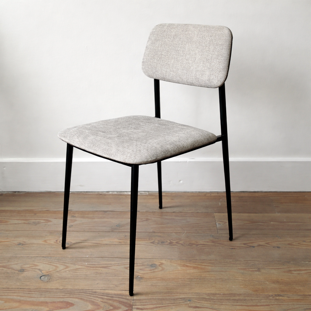 Chaise de réunion avec structure en métal noir et tissu gris clair.