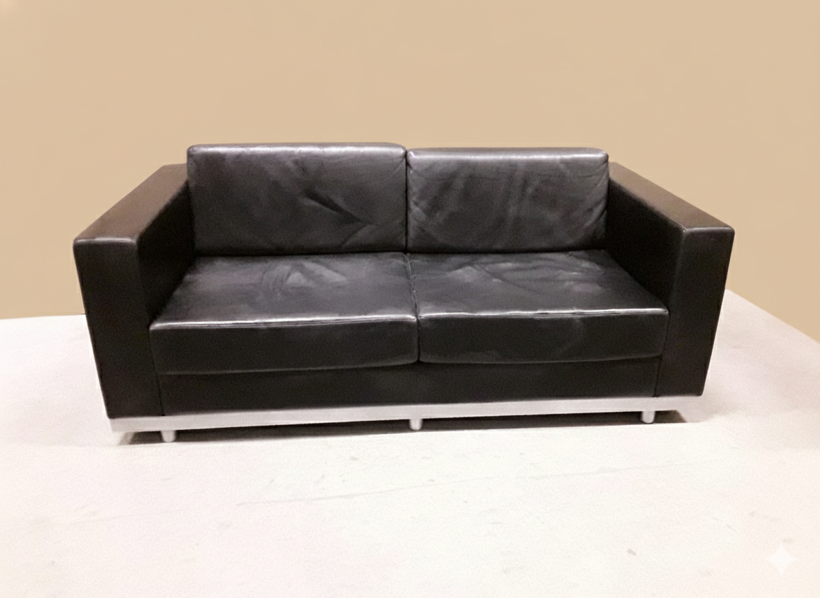 Canapé en cuir noir avec structure et pieds en acier inoxydable. Dimensions : 180 x 90 cm